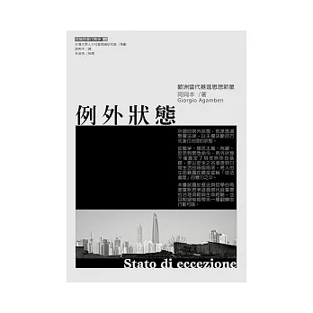 內容簡介: 所謂的例外狀態,就是透過懸置法律(憲法),用不受法律限制的措施進行治理的狀態。這彷彿是一個無法的狀態,生命被棄置、驅逐於法律之外,即成為赤裸的生命。